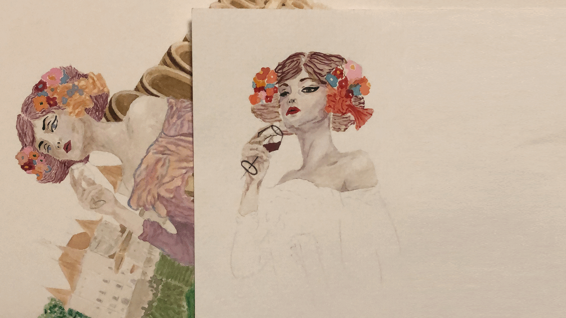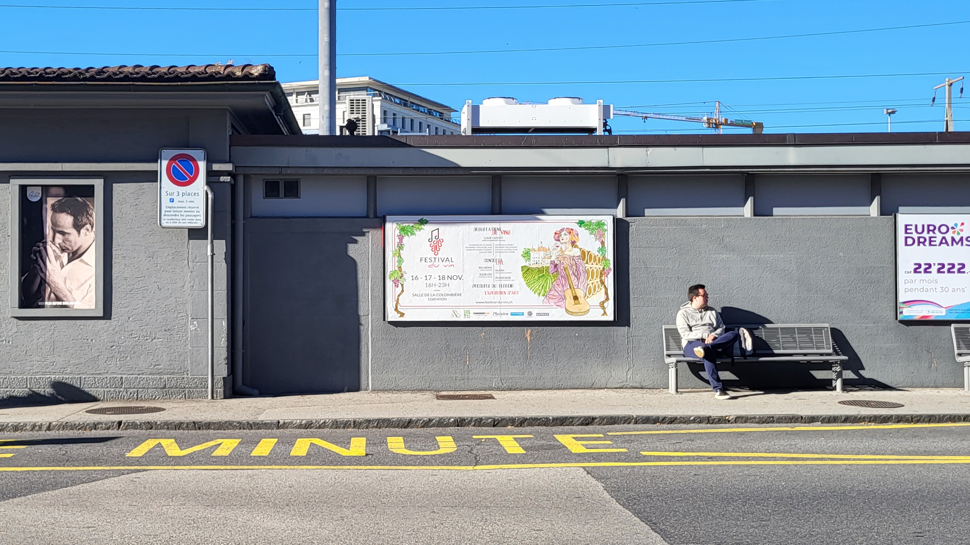 Après une période d’étude et de recherche, un concept de base a été créé. Le visuel a été réalisé à la main, puis vectorisé. Celui-ci présentait une jeune femme avec un verre de vin. Des vignes, des barriques et une vue du Château de Nyon l’entourait. Deux branches de vigne entourent l’affiche. Les différentes informations apparaissent selon la typographie établie précédemment par l’association nyonnaise.