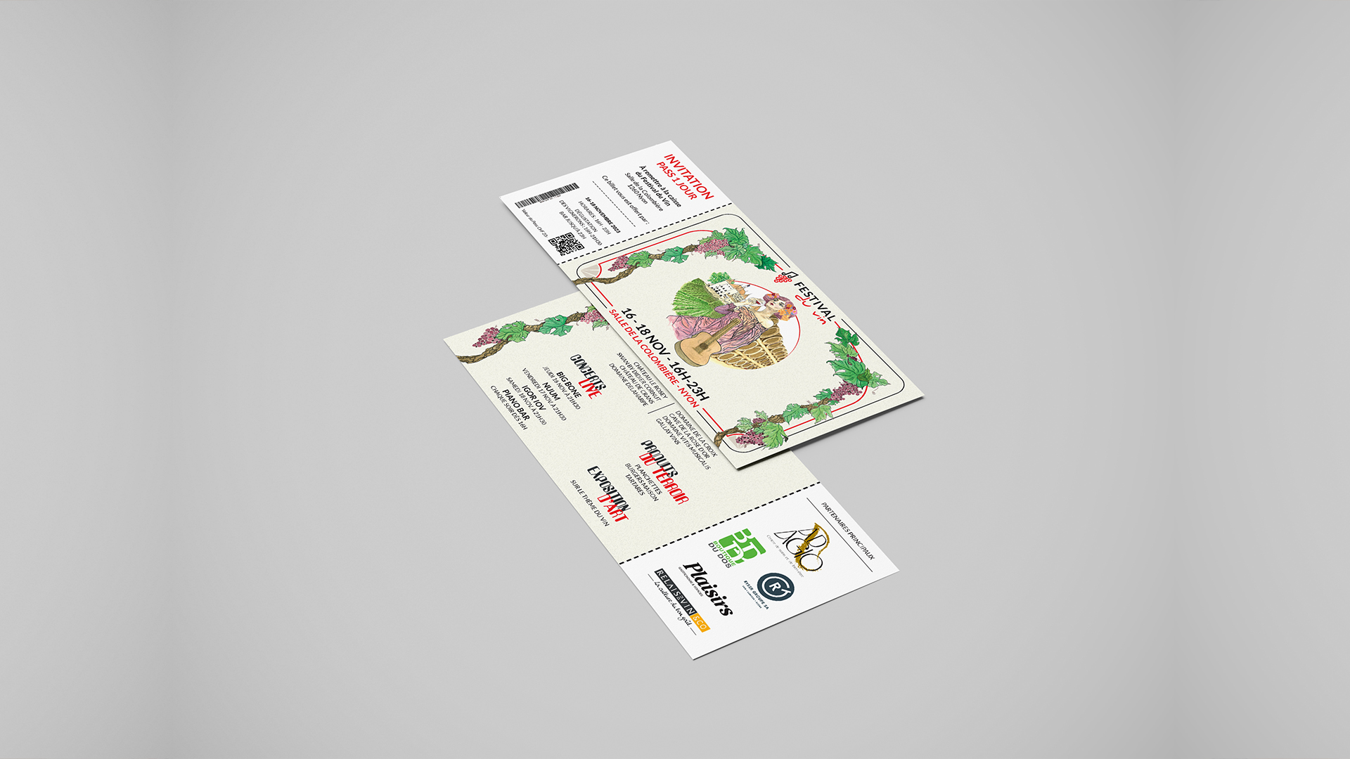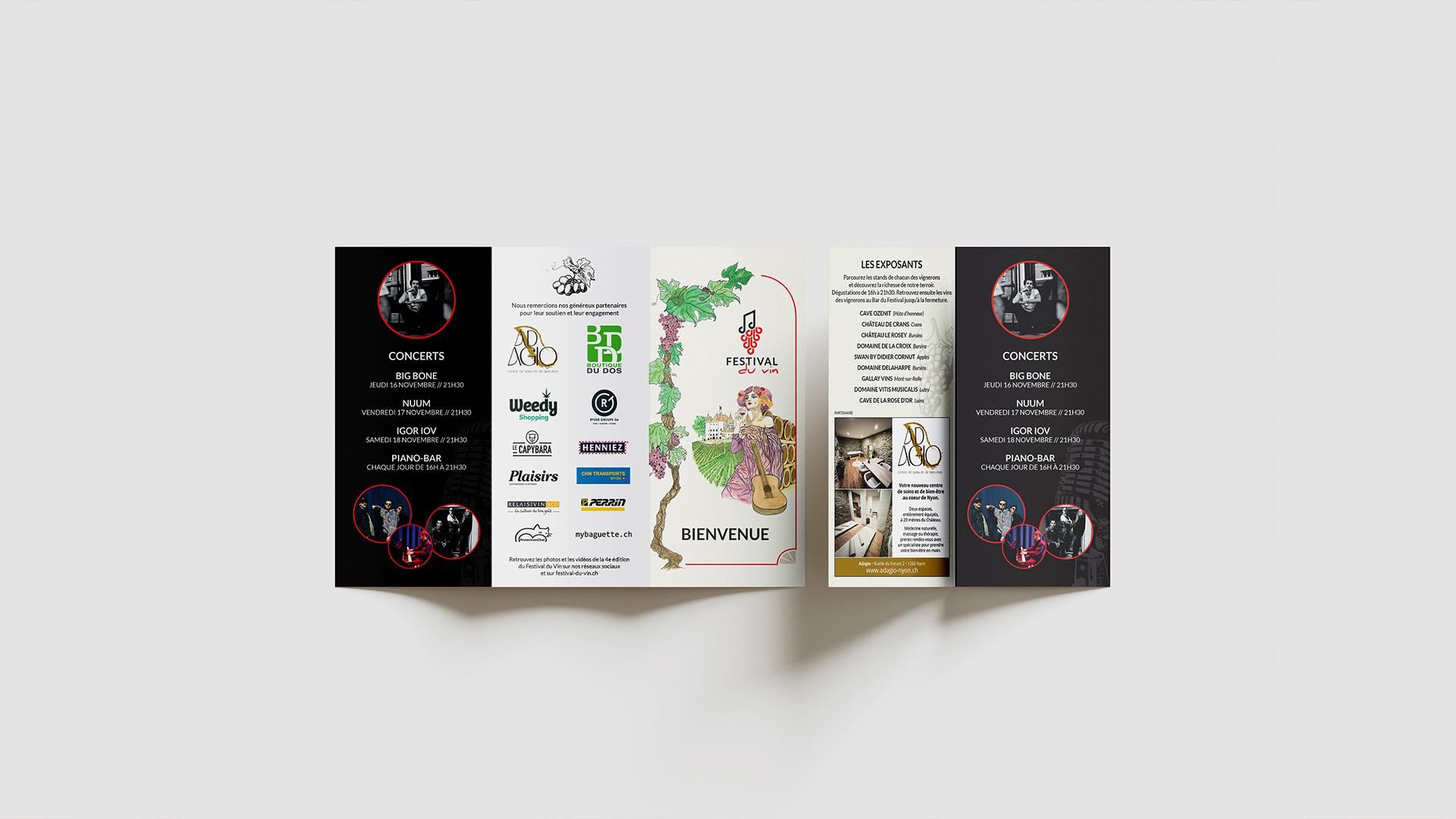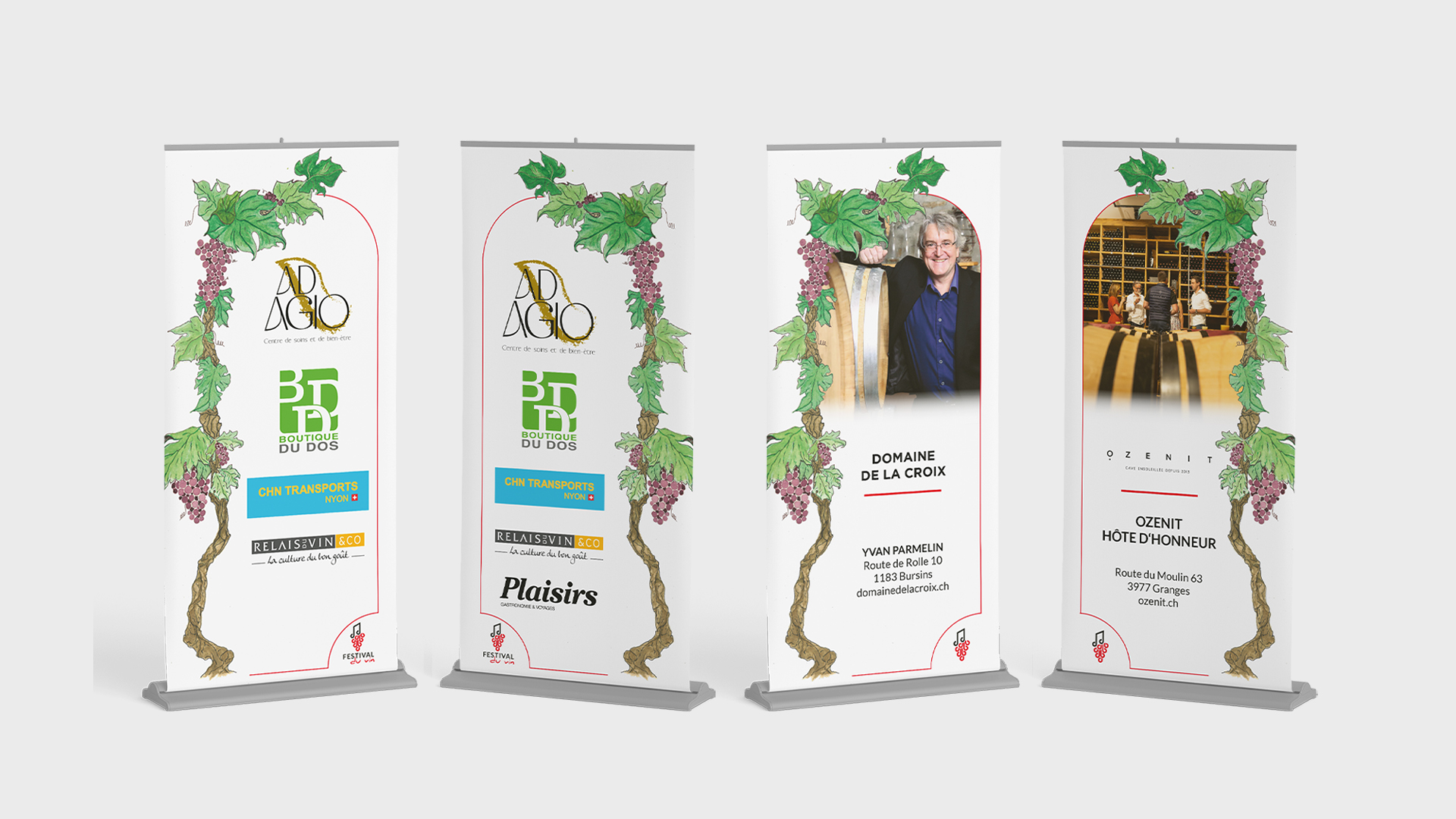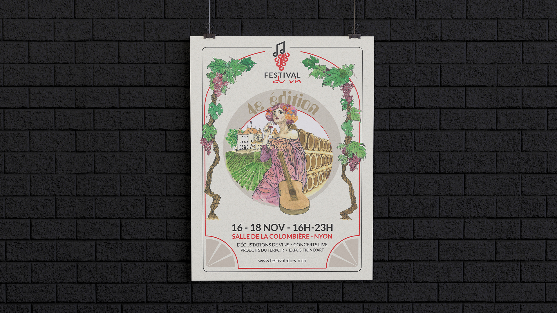 Après une période d’étude et de recherche, un concept de base a été créé. Le visuel a été réalisé à la main, puis vectorisé. Celui-ci présentait une jeune femme avec un verre de vin. Des vignes, des barriques et une vue du Château de Nyon l’entourait. Deux branches de vigne entourent l’affiche. Les différentes informations apparaissent selon la typographie établie précédemment par l’association nyonnaise.